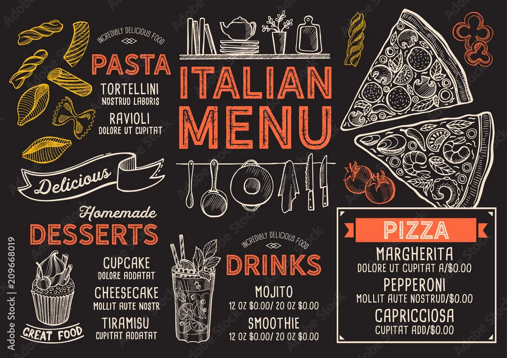 Fototapeta Menu restauracji pizzy. Ulotka żywności wektor dla baru i kawiarni. Szablon projektu z rocznika ręcznie rysowane ilustracje. - do kawiarni - Picturewall.pl