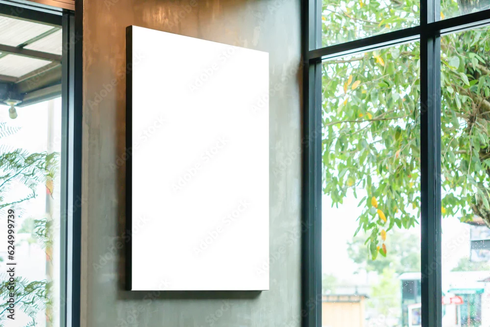 Fototapeta Mockup image of Blank billboard white screen posters for advertising, Blank photo frames display in coffee shop for your design - do kawiarni - Picturewall.pl
