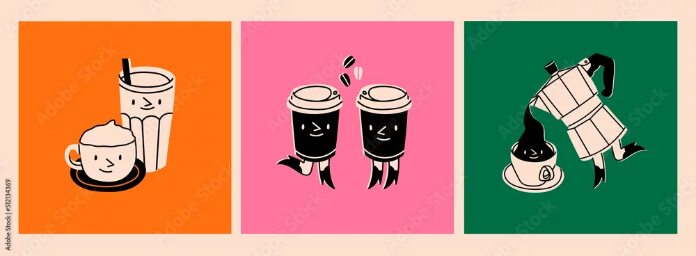 Moka pot, coffee cups with legs in boots. Cup and glass with faces. Logo, icon, coffee shop, menu design templates. Cute cartoon style characters. Three hand drawn isolated Vector illustrations