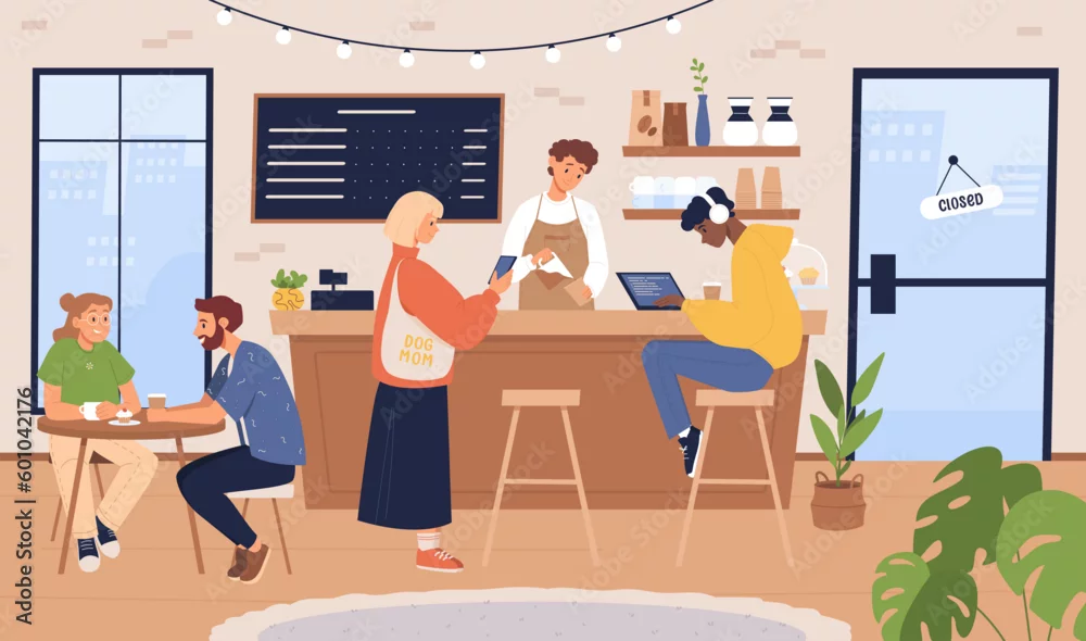 Fototapeta People in coffee shop vector illustration. Barista and customers inside cozy local cafe interior. Men and women drink coffee and tea in cafeteria or coffeehouse, bakery.