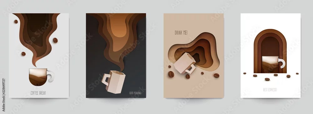 Set of coffee composition in minimalistic paper cut style. Design template for branding shop or cafe invitation, business card, menu page, banner, flyer. Vector illustration.