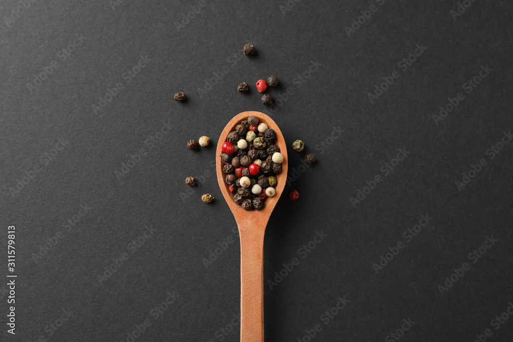 Fototapeta drewniana łyżka z kolorowymi ziarnami pieprzu na ciemnym tle