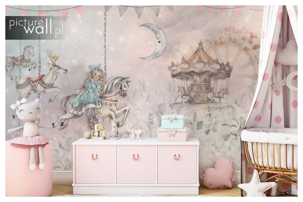 Fototapeta Karuzela to urocza dekoracja ścienna, idealna do pokoju dziecka. Motyw przedstawiający karuzelę w pastelowych kolorach wprowadza do wnętrza atmosferę magii i radości, sprzyjając wyciszeniu i relaksowi.