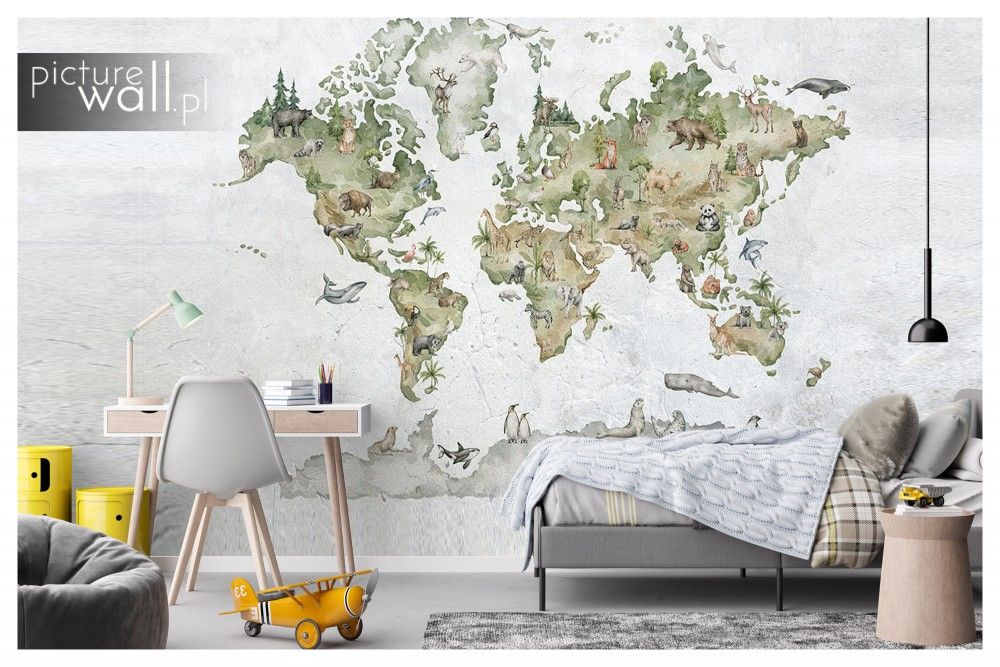 Fototapeta Mapa ze zwierzętami na betonowym tle to stylowa dekoracja ścienna, która łączy edukacyjny motyw mapy świata z ilustracjami zwierząt w subtelnej kolorystyce. Betonowe tło nadaje wnętrzu nowoczesnego charakteru, a detaliczne rysunki zwierząt pobudzają wyobraźnię dzieci. Idealna do pokoju dziecka, łącząc estetykę z edukacją.