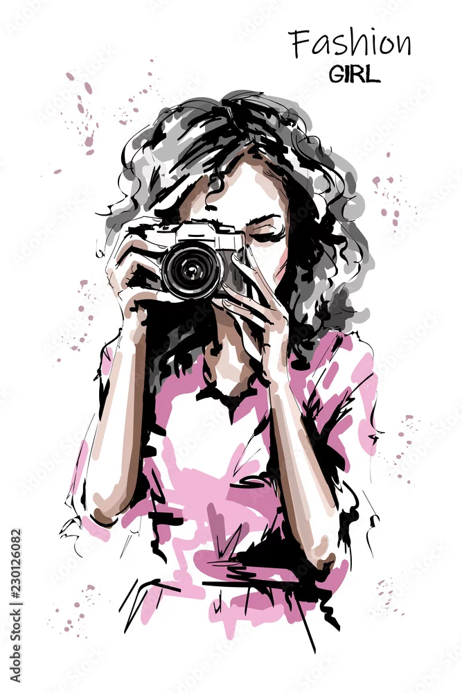 Fototapeta piękna, młoda kobieta z aparatem fotograficznym. Stylowa, elegancka dziewczyna.