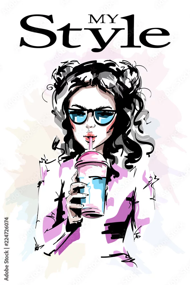 Fototapeta Ręcznie rysowane piękna młoda kobieta trzyma przezroczysty jednorazowy plastikowy kubek soku. Stylowa elegancka dziewczyna w okularach przeciwsłonecznych. Portret kobiety moda. Naszkicować.