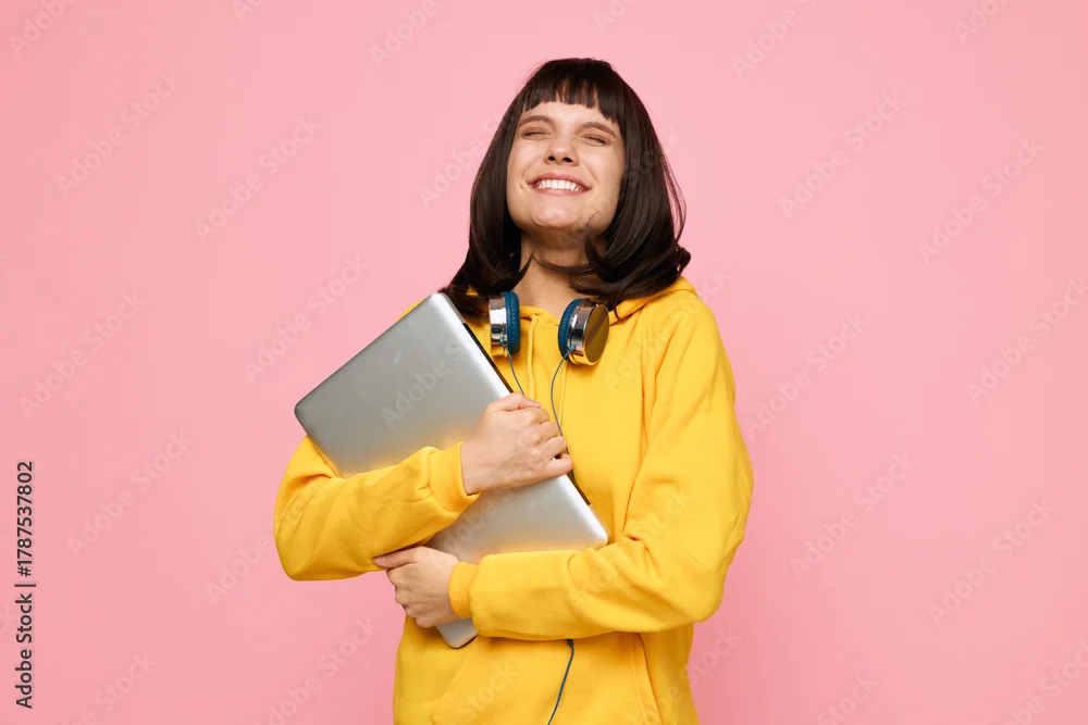 Fototapeta A cheerful student stands against a pink backdrop, hugging a laptop and wearing headphones. This bright, contemporary portrait conveys creativity, study, and positive energy.