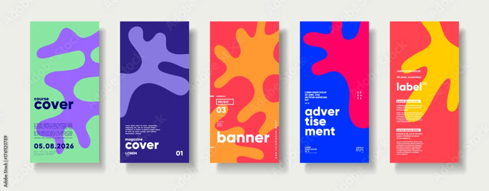 A vibrant collection of abstract poster designs featuring bold colors and organic shapes. Each poster showcases unique layouts suitable for courses, magazines, banners, advertisements, and labels.
