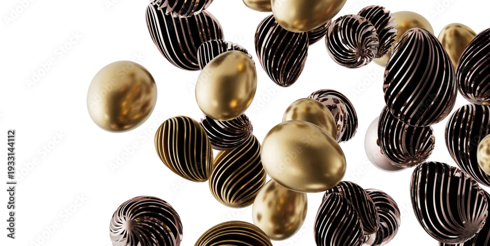Fototapeta Abstract image of golden easter eggs floating on a white background. Perfect for Easter, celebration, design and luxury