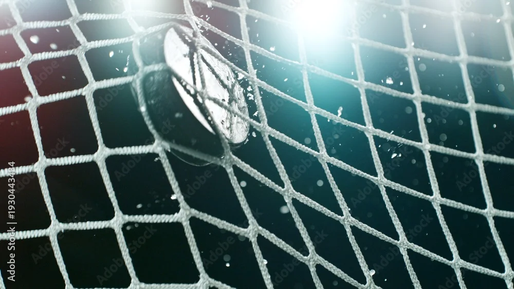 Fototapeta An ice hockey puck hitting the back of the net as it scores a goal - do przedpokoju - Picturewall.pl