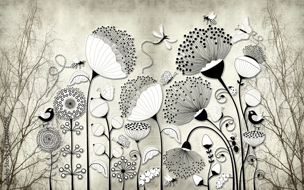 Fototapeta Artistic monochrome abstract floral mural with decorative design.