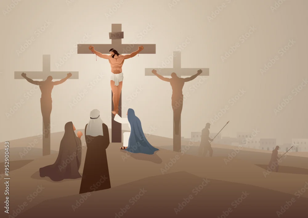 Fototapeta Biblical vector illustration series. Way of the Cross or Stations of the Cross, twelfth station, Jesus Nailed to the Cross, Crucifixion Scene. - do przedpokoju - Picturewall.pl
