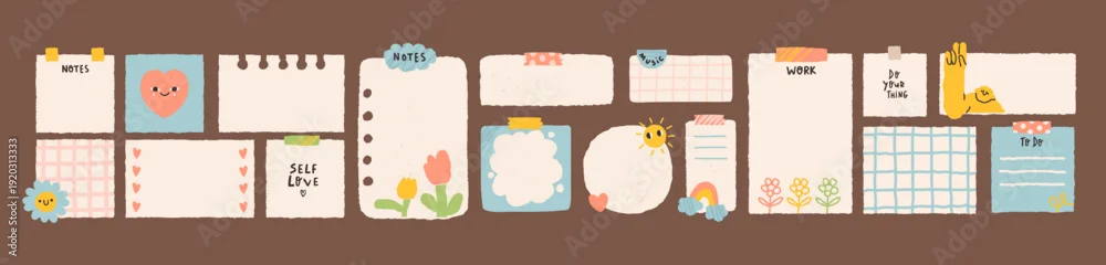 Big set of Paper notes, stickers. Information board with blank Paper sticky notes for reminders, to do list, planner, schedule. Hand drawn trendy Vector illustration. Isolated design elements