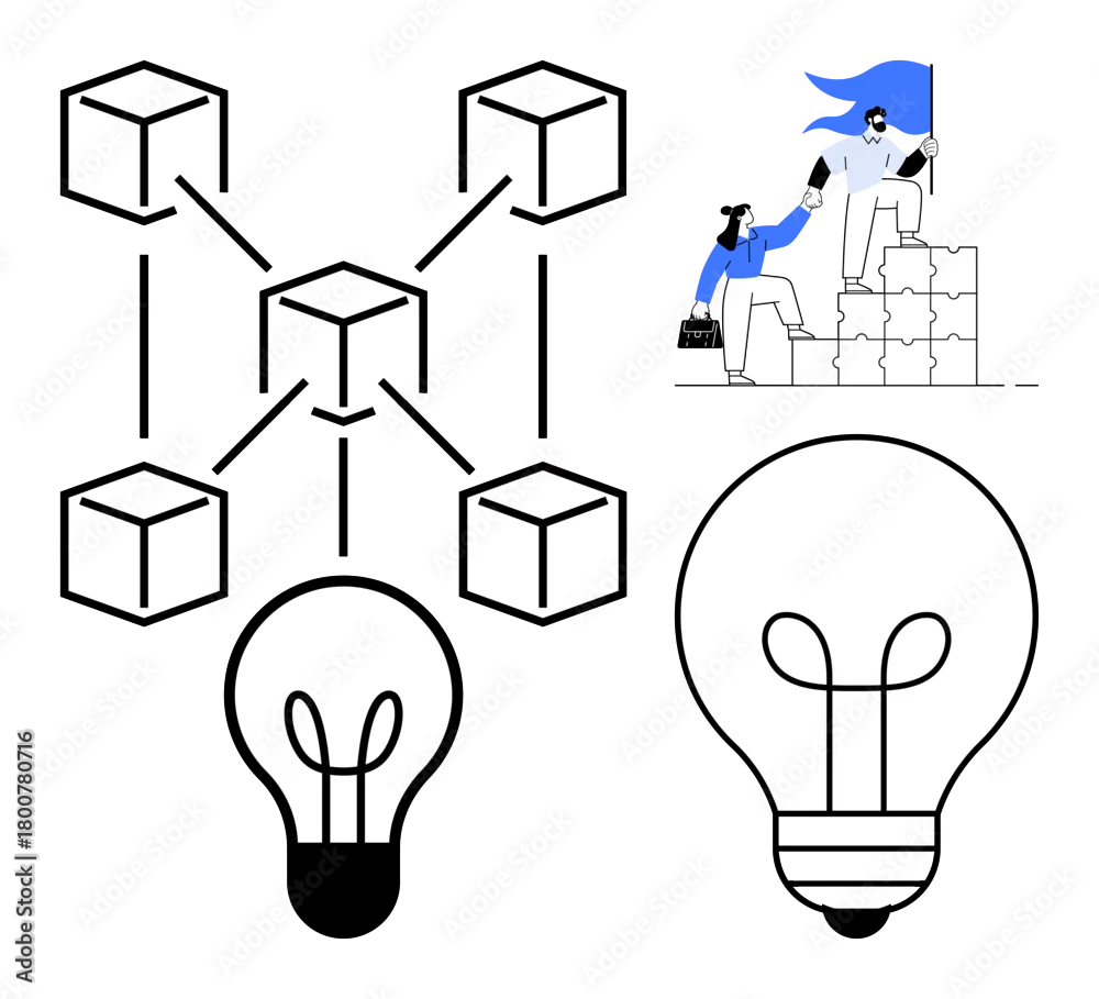 Blockchain structure with interconnected blocks, two professionals collaboratively solving problems, and glowing lightbulbs representing ideas. Ideal for innovation, teamwork, leadership