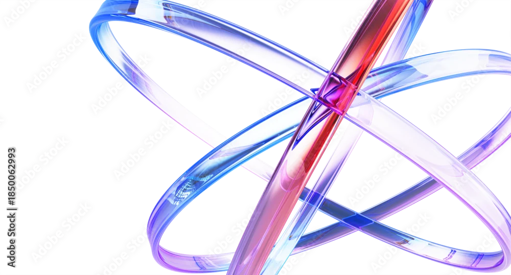 Blue science and tech 3d background with glass holographic transparent circle lines. Iridescent abstract structure of atom with purple red gradient for physics and chemistry design