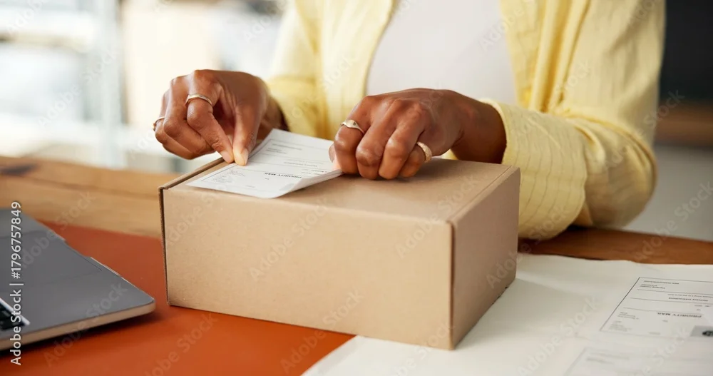 Fototapeta Box, label and logistics with hands of woman in office for shipping details, priority mail or info. Package sticker, business order or person with distribution for supply chain, delivery or ecommerce