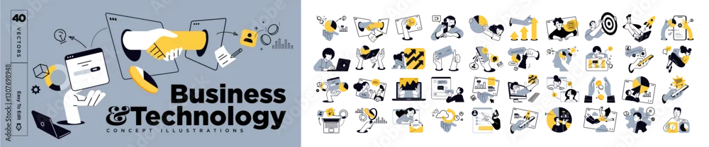 Business and technology illustrations. Concepts of web design and development, startup and online business, seo, app development, e-commerce, strategy and planning, communication.