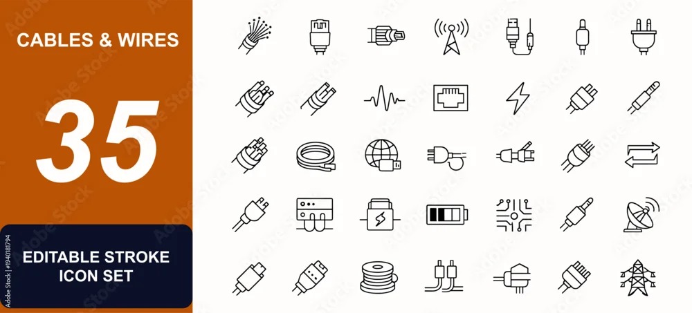 Fototapeta Cables and wires web icons in line style. Fiber optic, electrical connector, telecom signal, ethernet plug, copper conductor, power cord set. Editable stroke. Vector illustration.
