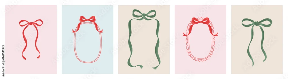 Christmas greeting card Set. Beautiful art design in trendy retro hand drawn doodle style with bow and ribbon frames. Xmas art banner, poster, cover templates.