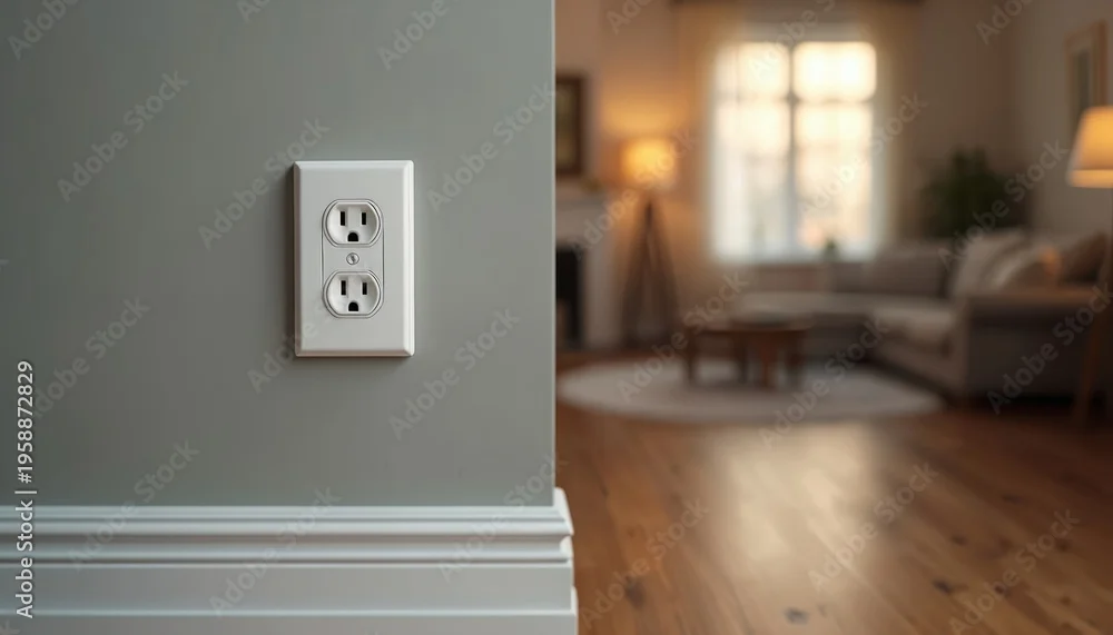 Fototapeta Close up of a double electrical outlet on a gray wall. In background blurred living room interior with furniture and window light. Clean residential power source. - do przedpokoju - Picturewall.pl