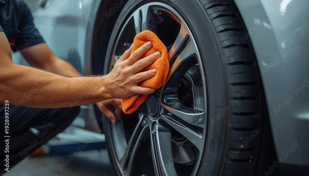 Fototapeta Close-up of a male mechanic wiping the discs on a car wheel in a workshop with an cloth. - do przedpokoju - Picturewall.pl