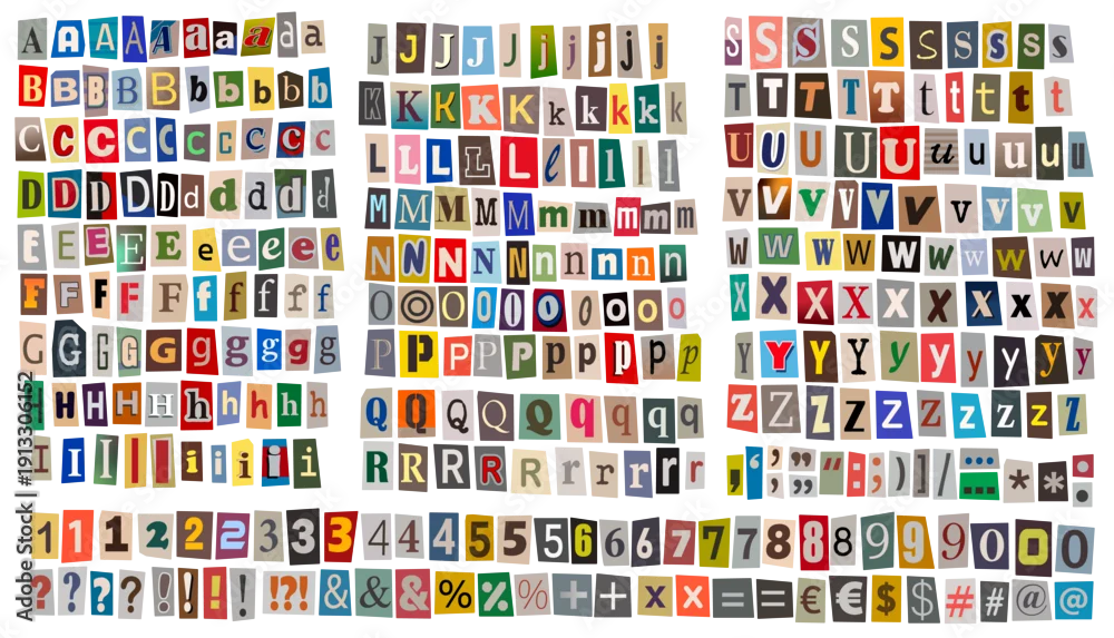 Fototapeta Collage of cut-out letters, numbers, and symbols on white.