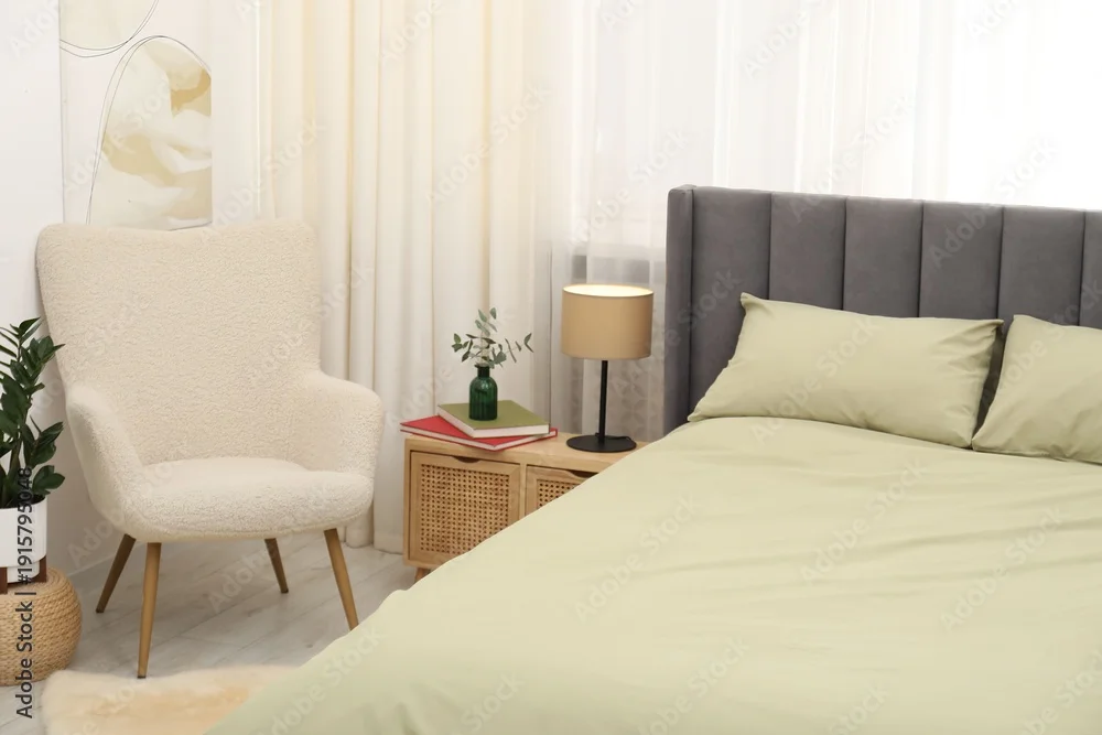 Fototapeta Comfortable bed with stylish linens at home
