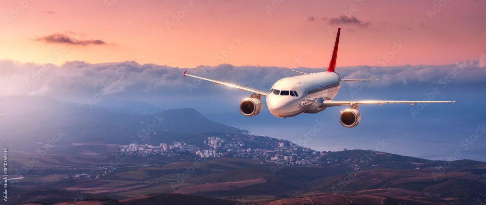 Fototapeta Commercial passenger airplane flying over sea coast and mountains at sunset. White aircraft in flight above sea and clouds during golden hour. Aviation, travel, transportation concept. Aerial view