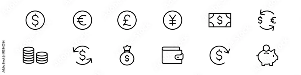 Currency and finance line icon set with money symbols, exchange, wallet, cash, savings, transactions, and financial savings for banking and fintech apps. thin line icon set collection. editable stroke