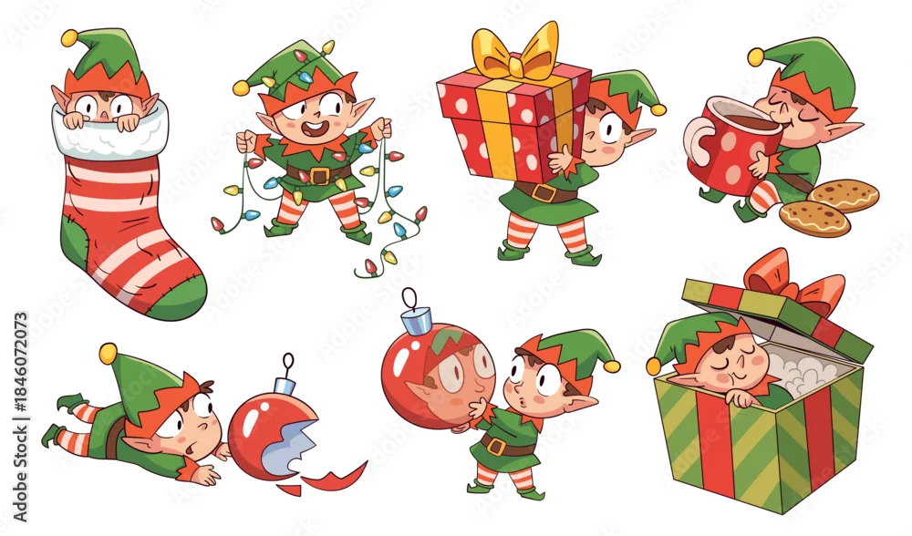 Cute Christmas elves in various festive poses: hiding in a stocking, tangled in lights, carrying gifts, drinking cocoa, breaking ornaments, decorating, and peeking from a present box