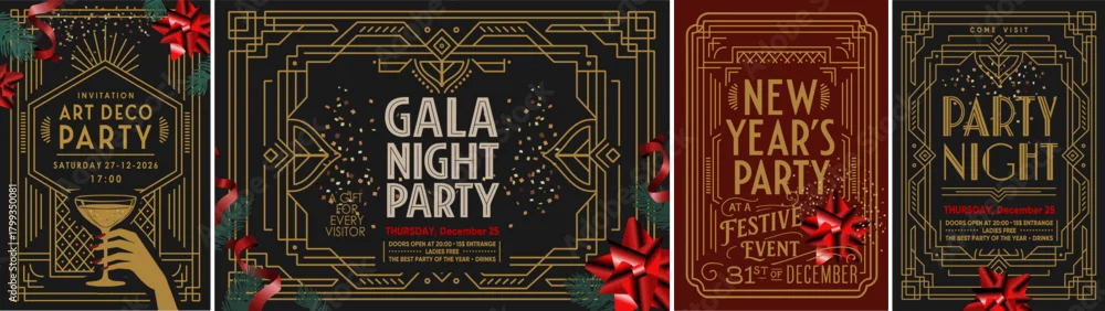 Elegant Art Deco party posters with gold geometric frame, festive confetti. Luxurious vintage design for gala invitation, New Year event, holiday party, and glamorous celebration