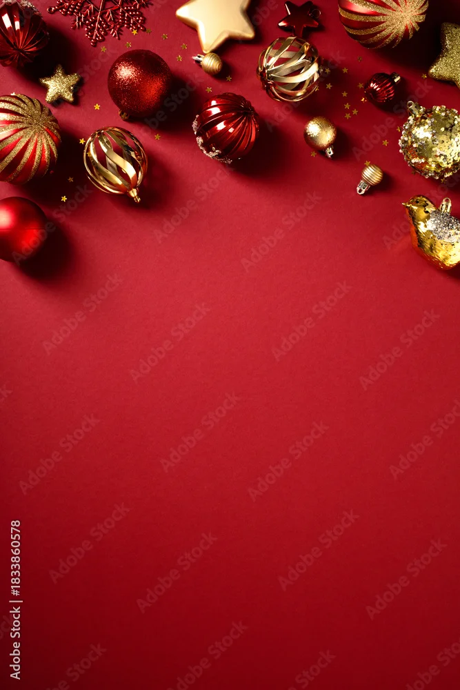 Fototapeta Elegant Christmas border of golden and red holiday ornaments on a vertical red background.