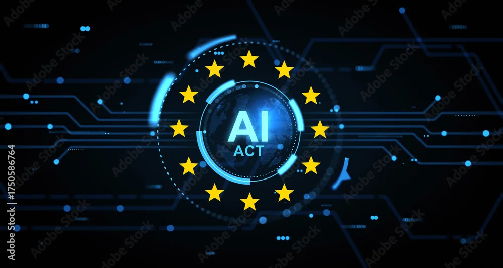 European Union AI Act hologram concept with glowing digital circuit background and EU stars around futuristic interface globe symbolizing regulation. 3D Rendering