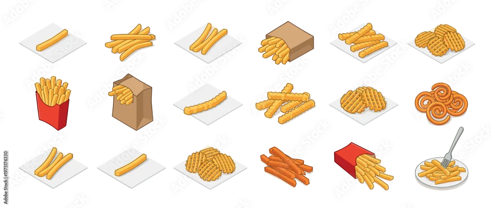 Fototapeta French fries and potato snacks isometric vector illustration set showing various types of fried potatoes in different serving styles. - do przedpokoju - Picturewall.pl