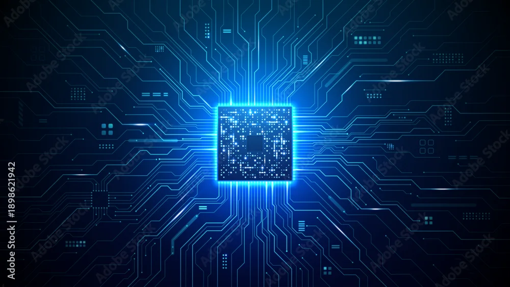 Futuristic processor with spreading electronic connections forming motherboard pattern, quantum computing visualization with glowing data pathways and abstract tech elements. Digital blue background