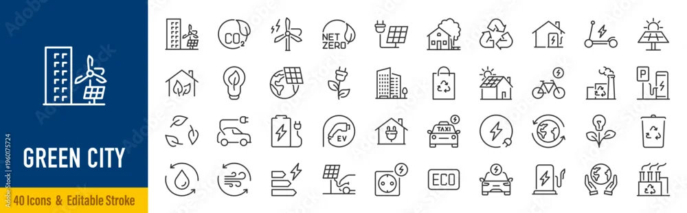 Fototapeta Green city web icons in line style. Green energy, autonomous building, efficient, environment, recycle technology, renewable solar, collection. Vector illustration. - do przedpokoju - Picturewall.pl