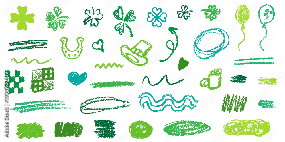 Hand drawn St. Patrick's Day elements set. Crayon kids drawing green clover leaf, shamrock, horseshoe, Leprechaun hat, balloon, heart. Chalk underlines set