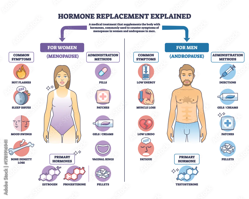 Fototapeta Hormone replacement explained, brief diagram comparing menopause and andropause symptoms, primary hormones and delivery methods, key objects, male figure, female figure, treatment icons. - do przedpokoju - Picturewall.pl