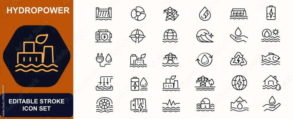 Fototapeta Hydropower web icons in line style. Dam turbine, renewable electricity, eco generator, clean energy, environmental technology. Editable stroke. Vector illustration. - do przedpokoju - Picturewall.pl