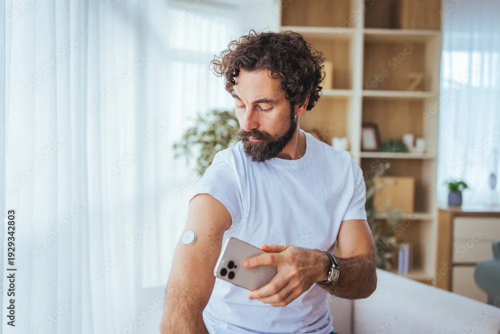 Fototapeta Man Checking Continuous Glucose Monitor With Smartphone At Home — Diabetes Health And Wellness