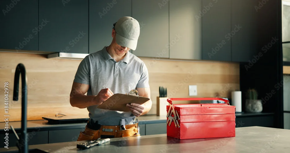 Fototapeta Man, technician and writing on clipboard at house for inspection, plumbing evaluation or report. Male person, toolbox and checklist for home maintenance, diagnostic notes and service costs of repairs