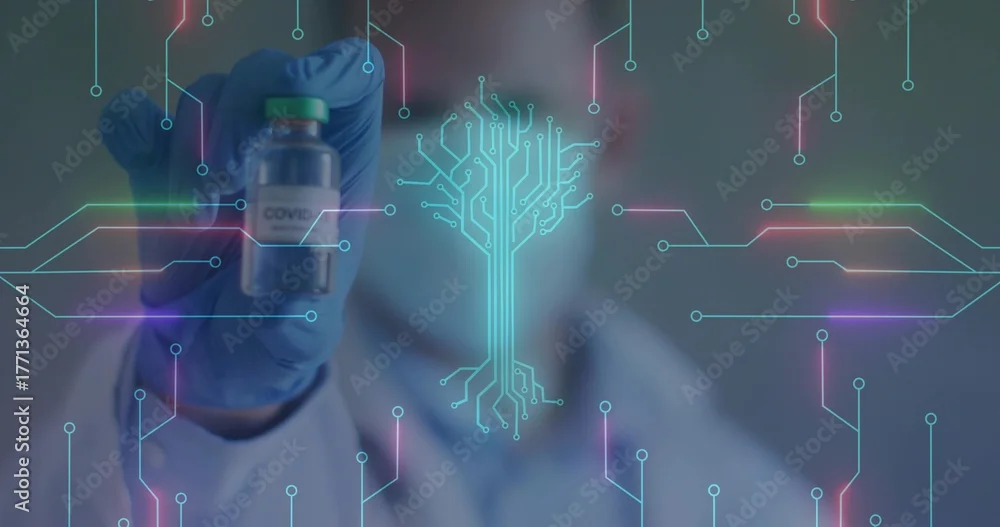 Fototapeta Medical researcher wearing mask, lab coat, gloves holding COVID-19 vial in lab, with neon circuits - do przedpokoju - Picturewall.pl
