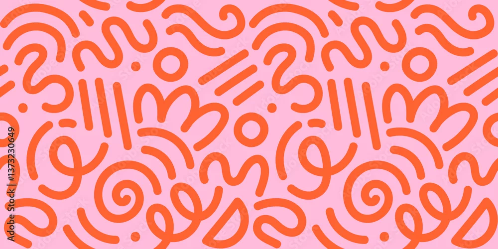 Fototapeta Memphis geometric seamless pattern. Multicolor abstract background in retro 80s, 90s style with various shapes: circles, dots, zigzags, spirals, wavy lines. Bright orange pink cute kid doodle design.