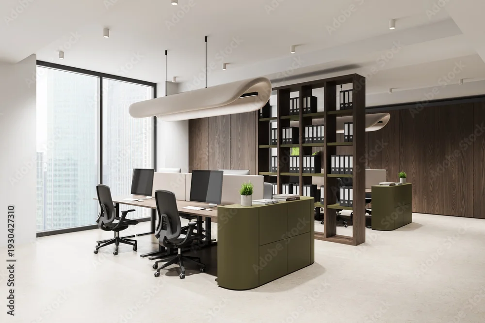 Modern open plan office interior with contemporary furniture, shelving units, large windows and minimalistic design elements."" 3D Rendering