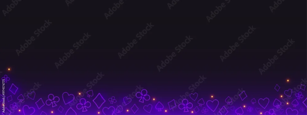 Fototapeta Neon online gambling casino border, purple poker card signs glowing on dark background. 3D Vegas blackjack game banner with futuristic design and outline symbols, vector illustration - do przedpokoju - Picturewall.pl
