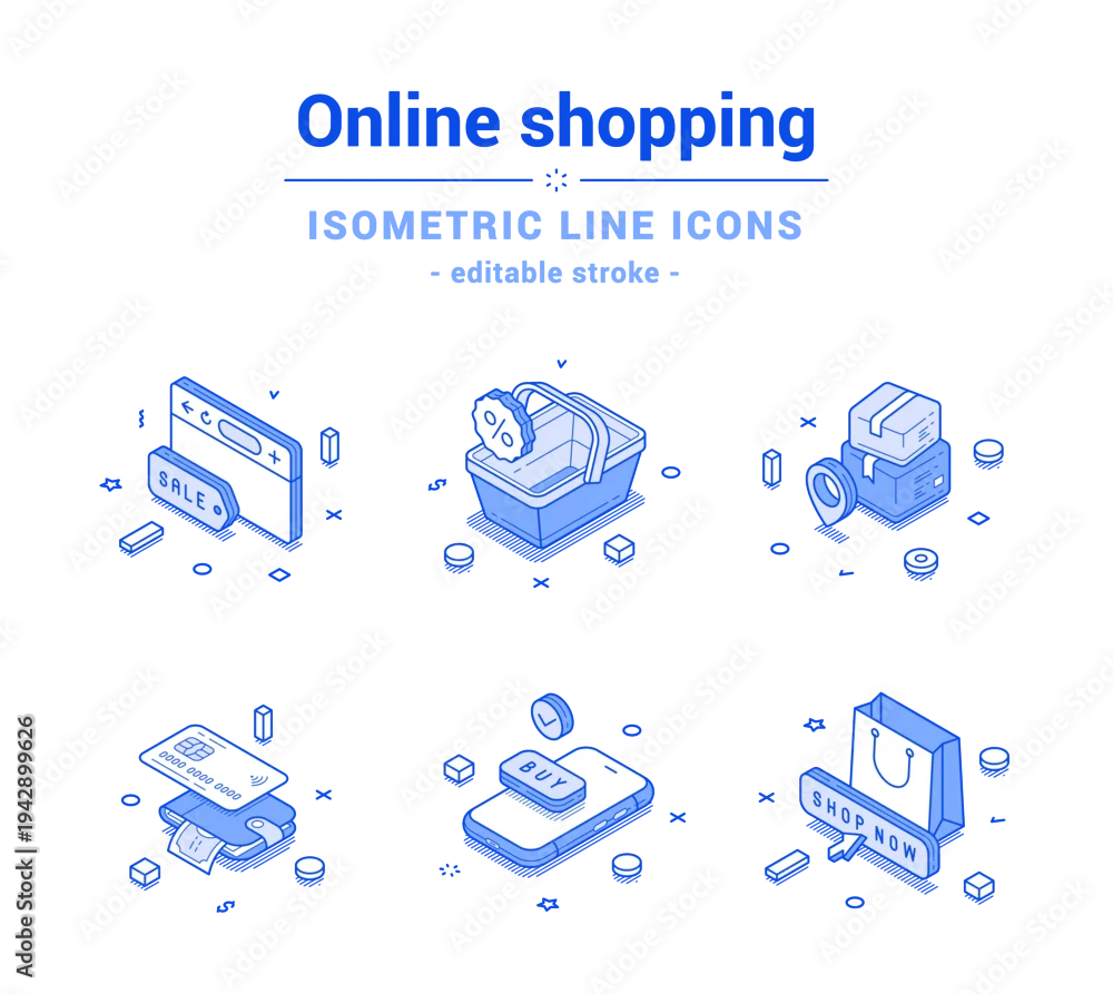 Fototapeta Online shopping sale web store delivery digital wallet mobile app outline line isometric icon set vector illustration. Internet banking shop market supermarket marketplace purchase paying buying goods