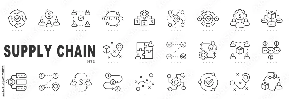 Fototapeta Outline supply chain icon set for logistics, workflow optimization, inventory management, distribution networks, editable stroke line icons for business UI design.