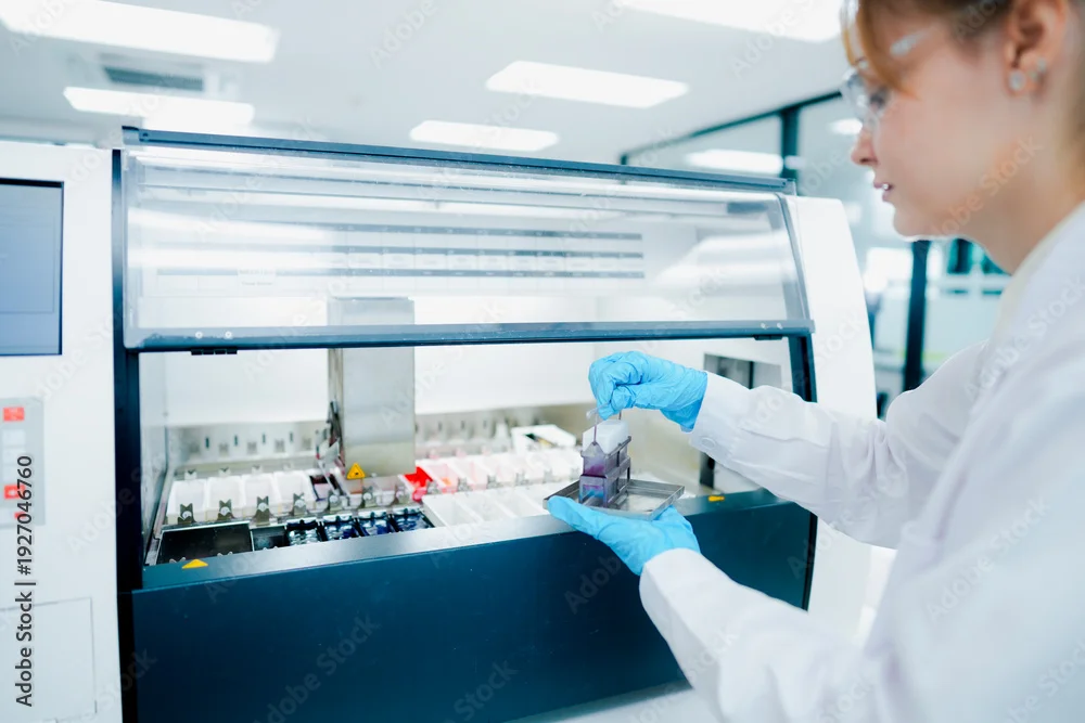 Fototapeta Pathological technician holding biopsy slide rack for quality inspection in clinical lab. Medical scientist preparing tissue sections for microscopic oncological diagnosis.