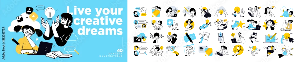 People vector illustrations in various activities of business, marketing, creative process, graphic and web design, social media, content management.