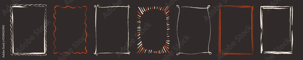 Fototapeta Set of chalk, crayon, charcoal, paint brush doodle hand drawn whimsical frames. Pastel scribble on the blackboard. Sketch border stamp for Christmas card, wedding, birthday, bachelorette invitation